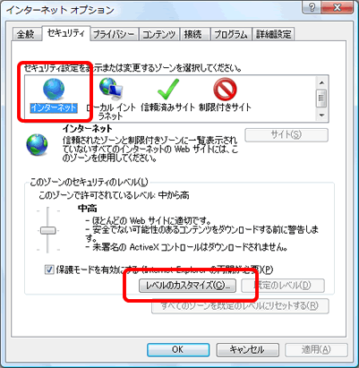 「インターネット」をクリックし、[レベルのカスタマイズ]をクリックします。