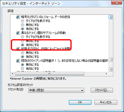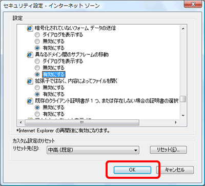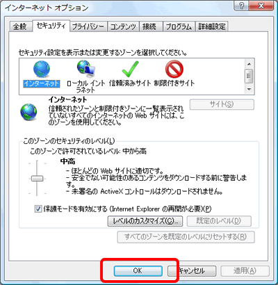 [OK]をクリックし、「セキュリティ設定 − インターネット ゾーン」画面を閉じます。