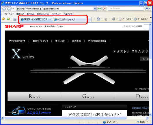 - Internet Explorerの画面右上の[×]をクリックし、Internet Explorer 7を終了します。