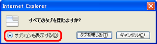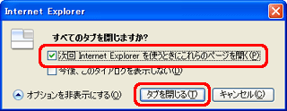 - 「次回 Internet Explorer を使うときにこれらのページを開く」をクリックしてチェックを付け、[タブを閉じる]をクリックします。