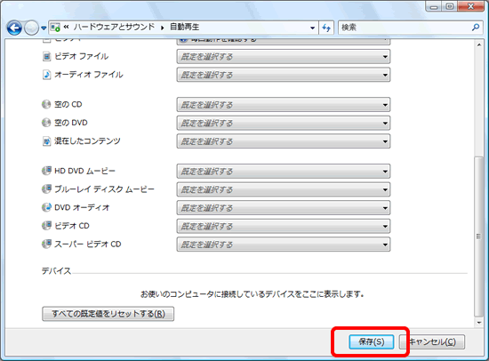 - ディスクの種類によって個別に動作を指定したいときは、「既定を選択する」ドロップダウンリストをクリックして、動作を指定します。