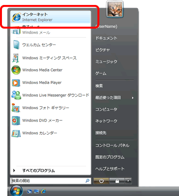 [スタート]をクリックし、「インターネット」をクリックします。