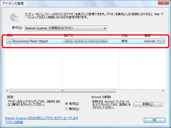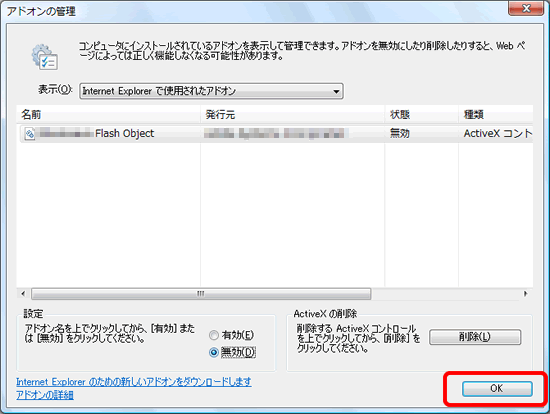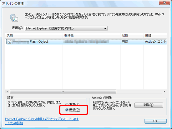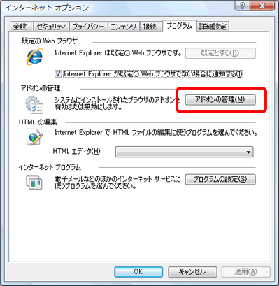 Internet Explorer 7に対応していないアドオンを使用した場合、「アドオンで問題が発生したため、InternetExplorerを閉じる必要があります」と表示されることがあります。 このメッセージが表示された場合はエラーメッセージに表示されているアドオンの名前を確認し、アドオンを使用しないように設定します。