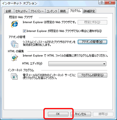 [OK]をクリックし、「インターネット オプション」画面を閉じます。