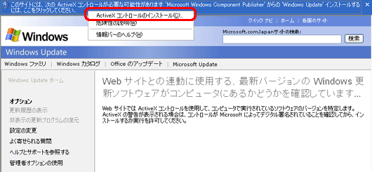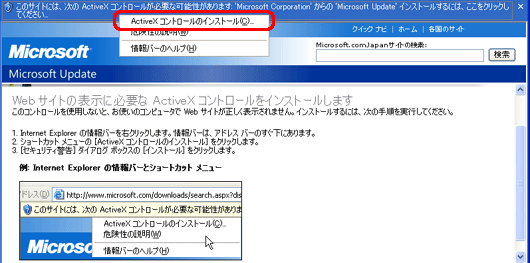 情報バーが表示された場合は、情報バーをクリックし、「ActveX コントロールのインストール」をクリックします。