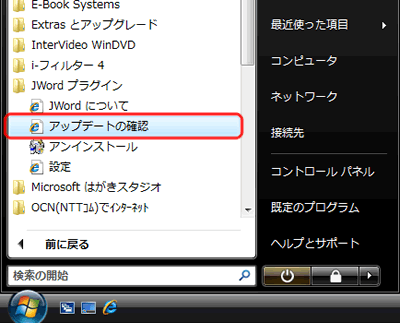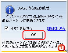 もしくは、[スタート]ボタン − 「すべてのプログラム」 − 「JWordプラグイン」から 「アップデートの確認」をクリックしてください。