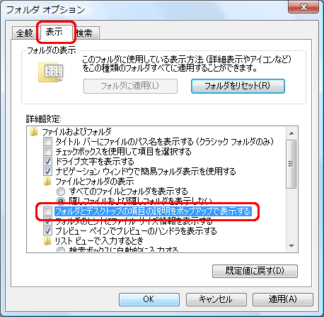 「表示」タブをクリックし、「フォルダとデスクトップの項目の説明をポップアップで表示する」をクリックしてチェックを外します。