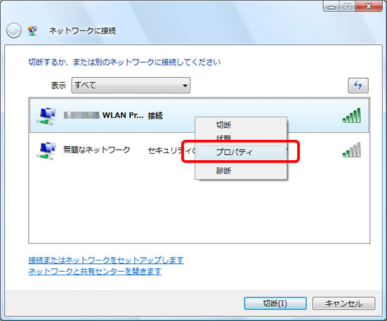 自動的に接続したネットワーク名を右クリックし、メニューから「プロパティ」をクリックします。