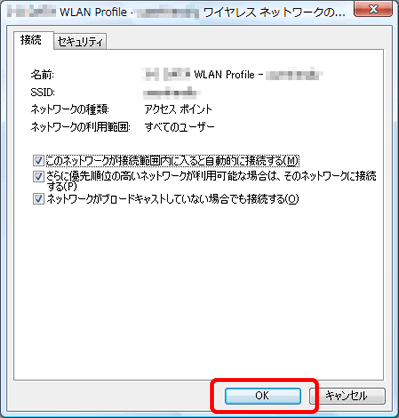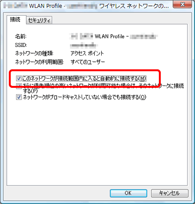 「このネットワークが接続範囲内に入ると自動的に接続する」チェックボックスをクリックしてチェックを付けます。