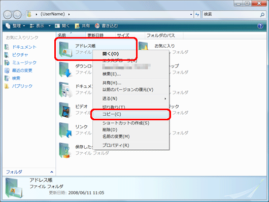 - 「アドレス帳」を右クリックし、「コピー」をクリックします。