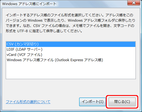 - インポートが完了したら[閉じる]をクリックして「Windows アドレス帳にインポート」画面を閉じます。