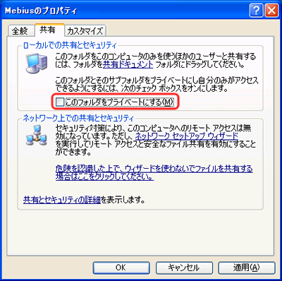 「ローカルでの共有とセキュリティ」欄の「このフォルダをプライベートにする」のチェックを外します。