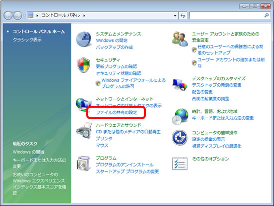 「ネットワークとインターネット」にある「ファイル共有の設定」をクリックします。