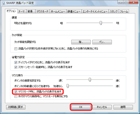 「オプション」タブをクリックし、「マウス操作」の「マウスモード時に、液晶パッドの表示を消す」をクリックしてチェックマークを付け、[OK]をクリックします。