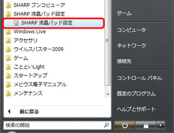 - [スタート]をクリックし、「すべてのプログラム」−「SHARP 液晶パッド設定」−「SHARP 液晶パッド設定」をクリックします。