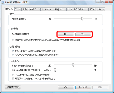 - 「タッチ機能」欄の「指」または「ペン」をクリックします。