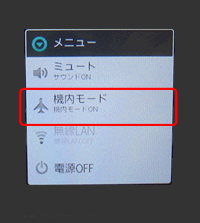 電源ボタンを2秒間 押して、メニューを表示させ(右図参照)、「機内モード」をタップすることでも、機内モードを「ON」から「OFF」に変更できます。