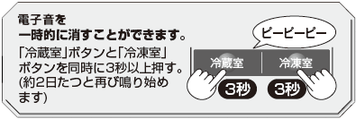 ドア閉め忘れ防止ブザーのアラーム音を一時的に止めたいときは、操作パネルの「冷凍室」と「冷蔵室」のボタンを同時に3秒以上押してください。