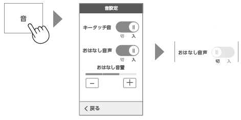 おはなし音声 を止めるときは、[音]にタッチし、「おはなし音声」を[切]にします。
