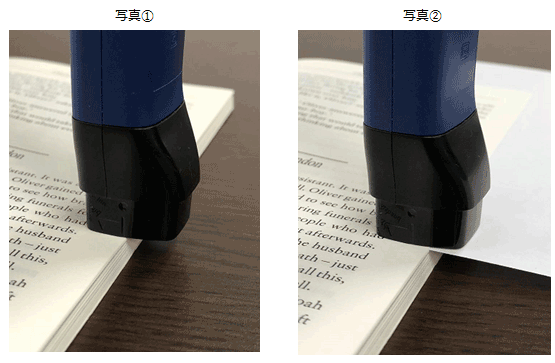 このような場合は、写真②のように、当該ページの下に紙を挟むなどして、段差をなくした状態でなぞってください。