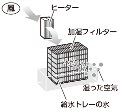 水を沸とうさせて蒸気 (湯気)を出す方式ではなく、水分を含ませたフィルターに風を当てて湿った空気を出す方式なので、蒸気(湯気 )は見えません。