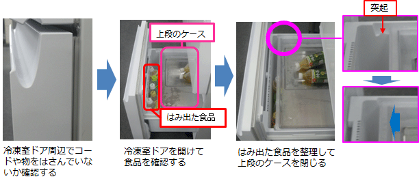 隙間があるときは、冷凍ケース(下)の食品がはみ出して上側ケースで挟んでいないか確認してください。