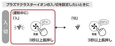 風量ボタンを3秒以上長押しして、プラズマクラスターイオン「入」に設定してください。