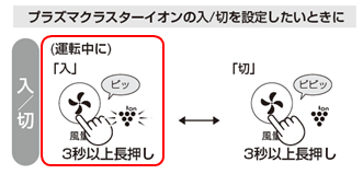 風量ボタンを3秒以上長押しして、プラズマクラスターイオン「入」に設定してください。