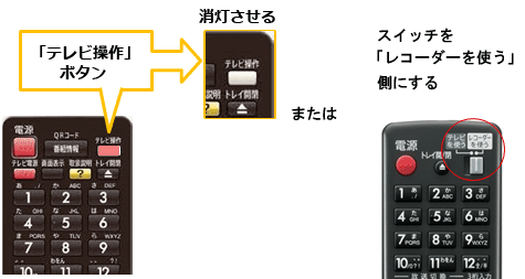 「テレビ操作」ボタンを押して消灯させ、「レコーダー操作モード」に切り替えてください。
