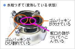 長期のご使用など、水栓つぎてのゴムパッキンが変形、劣化すると蛇口と密着できず、水漏れの原因になります。