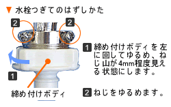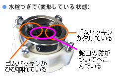 長期のご使用など、水栓つぎてのゴムパッキンが変形、劣化すると蛇口と密着できず、水漏れの原因になります。