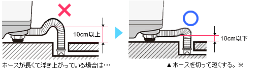 排水ホースの一番高い個所が10cm以下であれば、排水ホースは正常に設置されています。