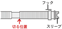 排水ホースが長い場合は、ホースをくびれた部分で切り取り、切り取ったホースに付いているスリープを短くしたホースへ付け替えてください。
